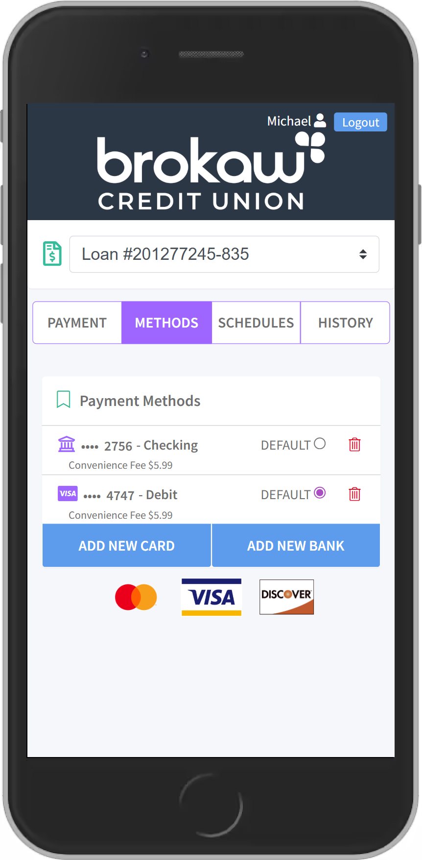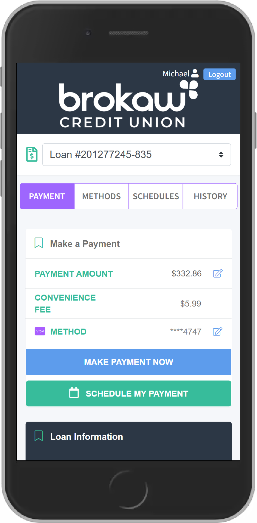 Make a payment to your Brokaw Credit Union loans quickly and easily from an external savings, checking, debit or credit card!